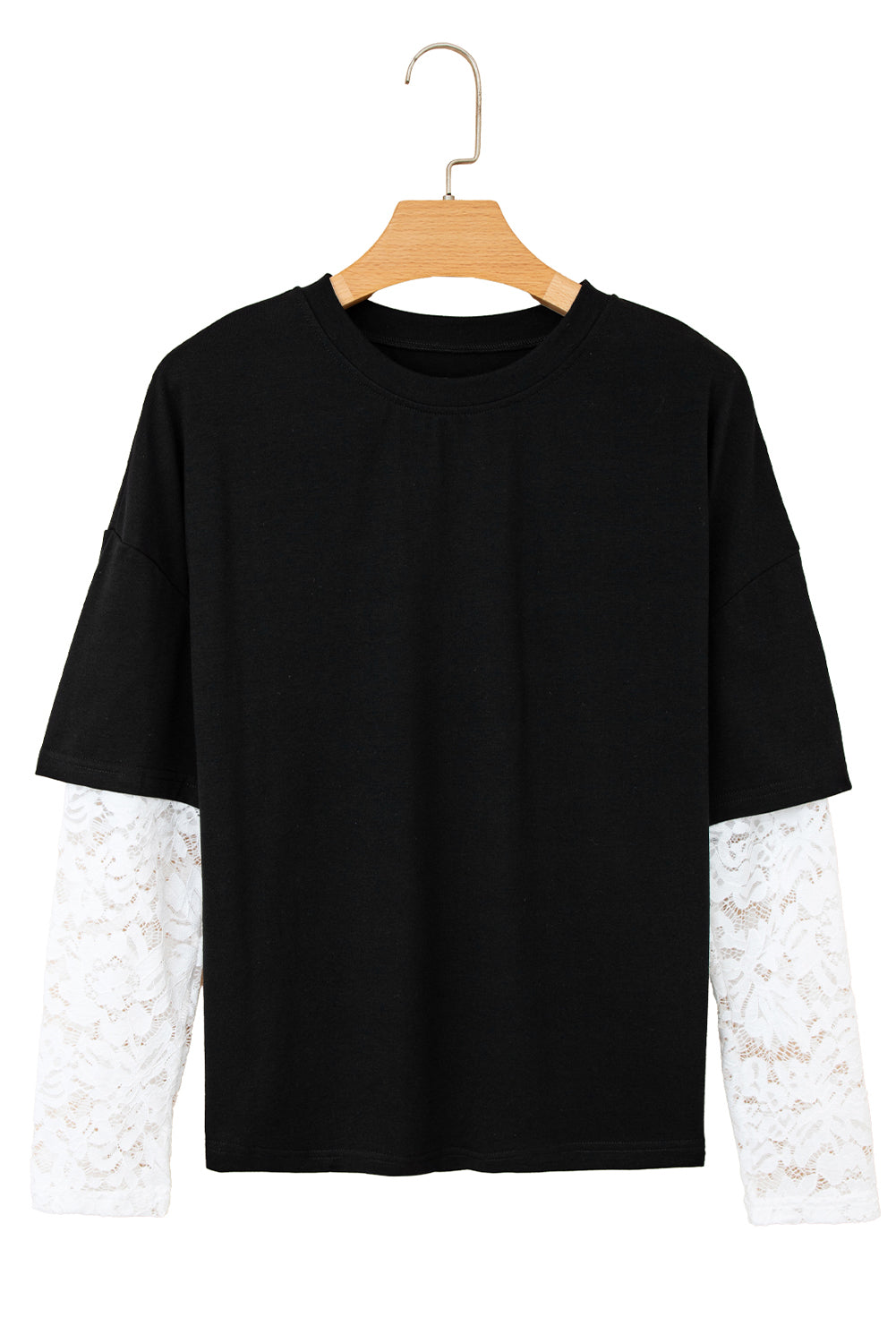 Meet The Elaine, a playful twist on classic style. This black long-sleeve tee features a faux two-piece design with delicate lace details and trendy drop shoulders. It's perfect for adding a flirty edge to your everyday look while keeping things comfy and casual.