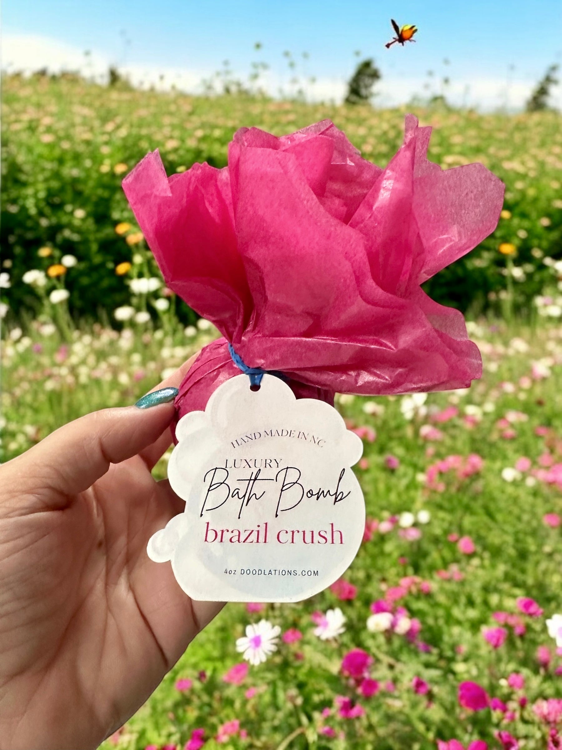 Indulge in some luxurious self-care with our Brazil Crush Bath Bomb! Handmade with love, these bath bombs will leave your skin feeling irresistibly soft. Beautifully packaged, it's a perfect addition to your pampering routine. And with its irresistible scent of Sol de Janeiro 40, it's a treat for the senses. Large 4 oz bath bomb.