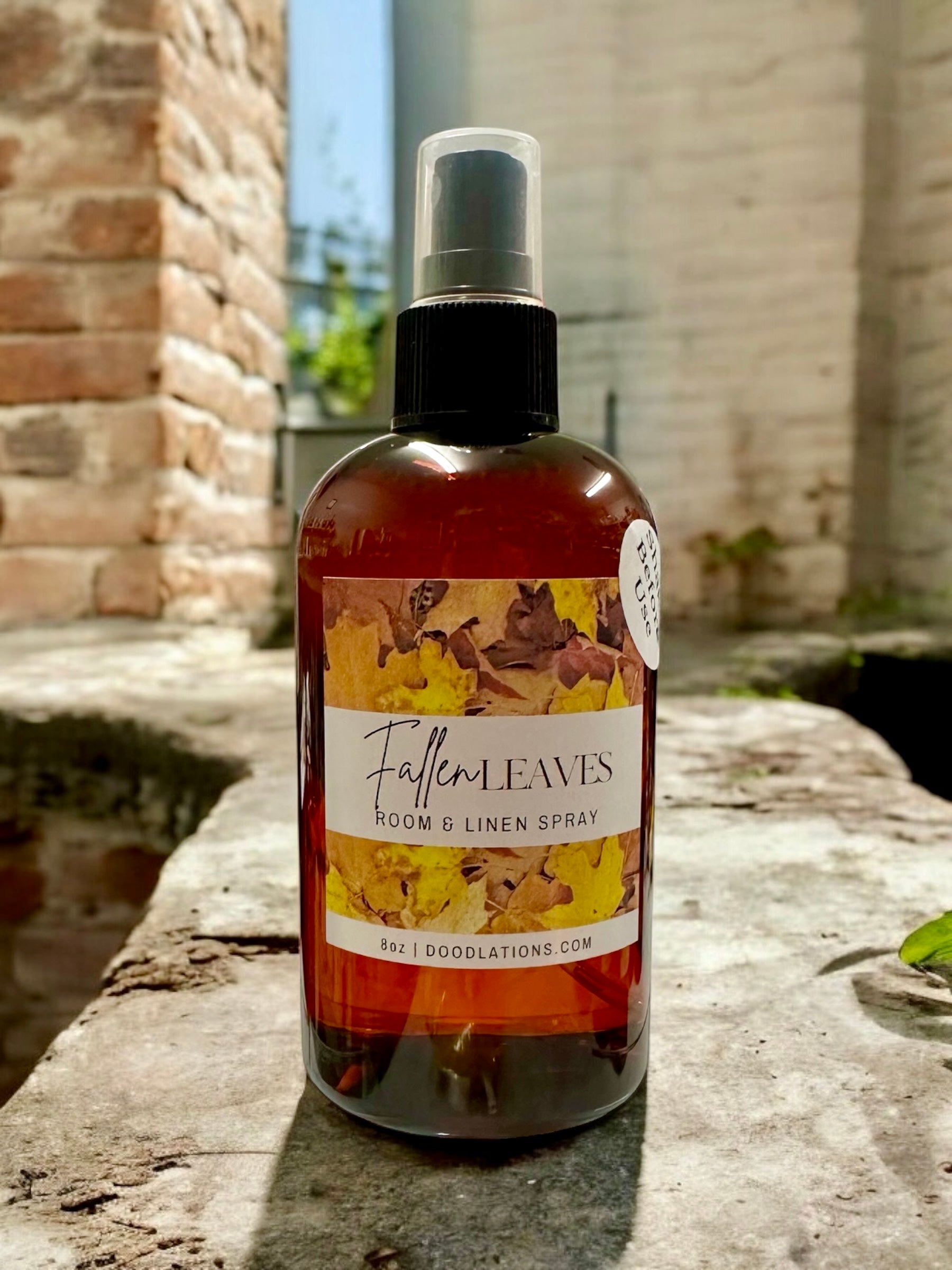 Wrap yourself in the smell of autumn air with our vibrant Fallen Leaves room spray. This warm and inviting fragrance starts with top notes of cinnamon, citrus, and chrysanthemum. At the core of the fragrance, the sweetness of apple and berries combines with green leaves. Pecan and cedar base notes enhance the natural outdoor quality, while balancing the fruit and spice notes. The earthiness of this scent is enhanced by an infusion of cinnamon leaf, patchouli, cedarwood, vetiver, and sandalwood essential oils. This room spray is infused with natural essential oils, including cinnamon leaf, cinnamon bark, patchouli, cedarwood, vetiver, and sandalwood.