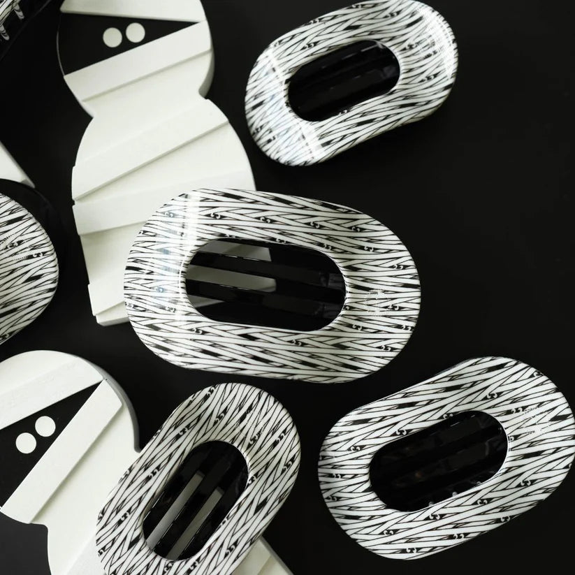 Lay flat and relax with the new TELETIES Mummy Knows Best Small Flat Round Hair Clip in Black and White. This hair clip is designed to allow you to lay back flat, do yoga, or sit comfortably in a seat with a headrest, and it is made with the same material that is nearly unbreakable.