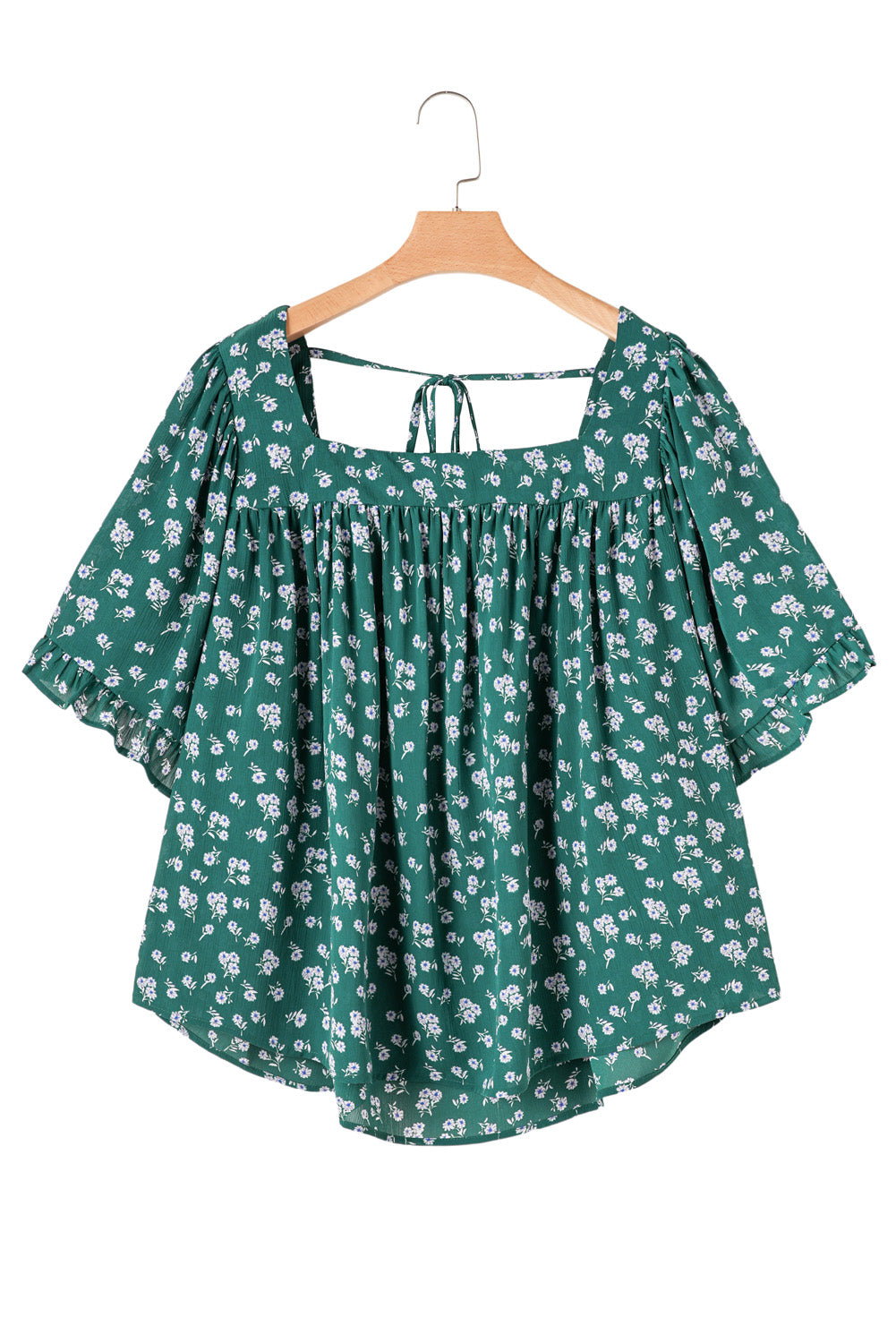 Add a fresh twist to your wardrobe with The Ivy, a playful plus-size blouse featuring a charming green floral print. Its square neckline and delicate ruffle trim bring a flirty touch, while the tie-back detail adds a fun, adjustable fit. Perfect for sunny days or casual outings, this blouse combines comfort and style effortlessly.