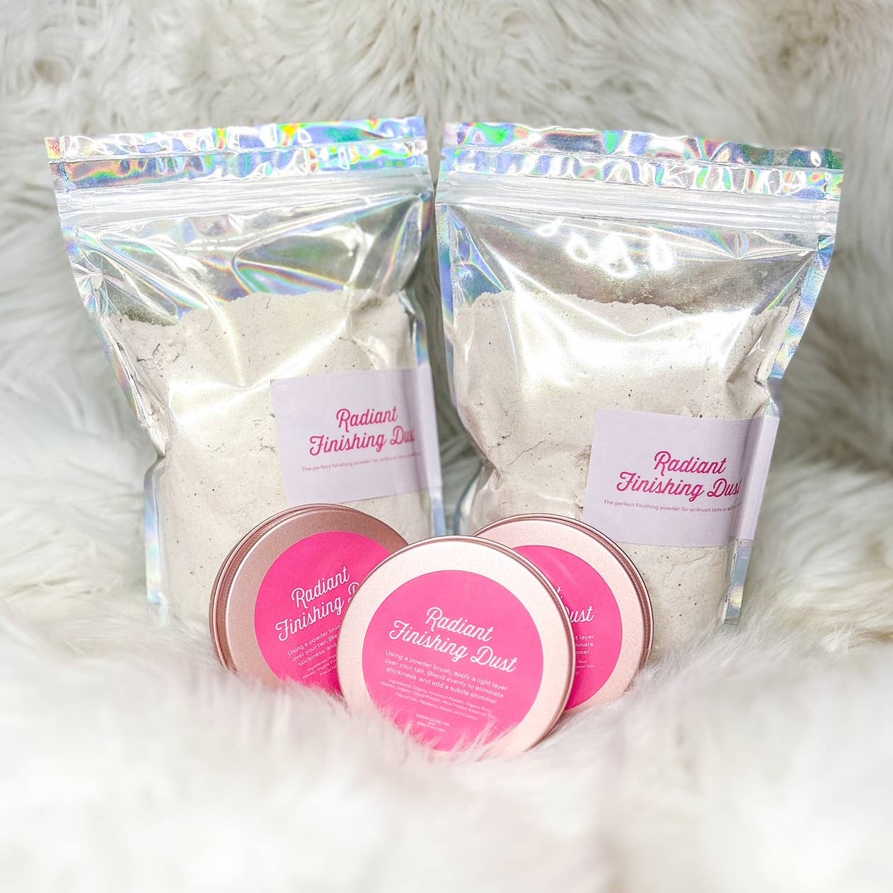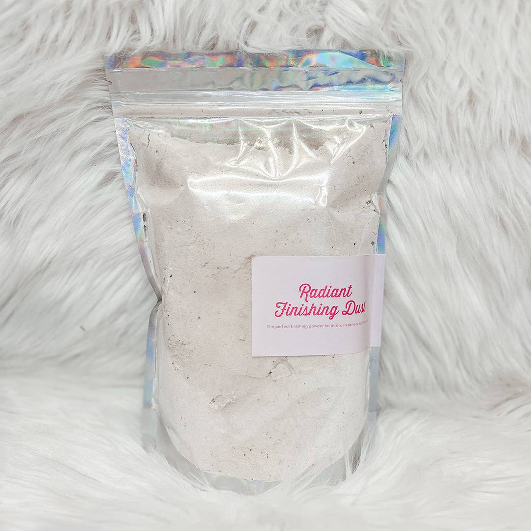 Complete your tanning routine with our Radiant Finishing Dust. This luxurious powder sets your tan and minimizes stickiness, leaving your skin with a beautiful, radiant glow. Infused with mica powder for a subtle shimmer but not super glittery like other powders. Perfect for a flawless finish, the lightweight powder blends seamlessly onto the skin. Also ideal for spray tan artists to enhance their client's experience and ensure they leave feeling set and ready to go. For use all over the body neck, under the breasts, bend of arm, underarms, under the buttocks, and behind the knees. -Enhances and sets your tan -Eliminates stickiness for a comfortable finish -Reduces shine for a matte finish with a light hint of shimmer -Lightweight and silky texture -Paraben, gluten, and cruelty-free. Ingredients: Organic Arrowroot Powder, Organic Rice Powder, Organic Cocoa Powder, and Essential Oils.