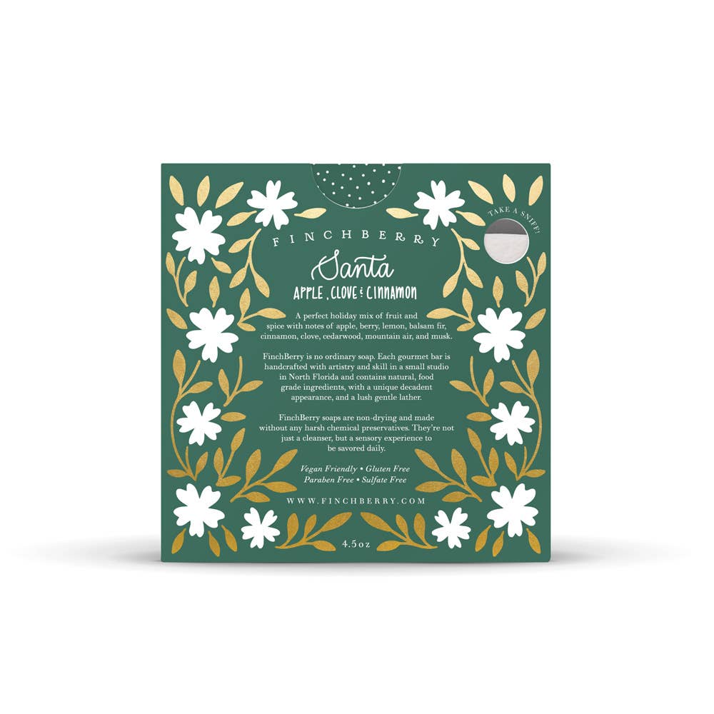 Our Santa Boxed Soap is the perfect Christmas holiday stocking stuffer. This festive soap offers a delightful blend of fruit and spice with notes of apple, berry, lemon, balsam fir, cinnamon, clove, cedarwood, mountain air, and musk. Crafted with purified water and saponified oils of organic olive, organic coconut, palm, and shea butter, it also includes select essential and/or fragrance oils, mica, oxides, and cosmetic glitter. Give the gift of FinchBerry this holiday season!