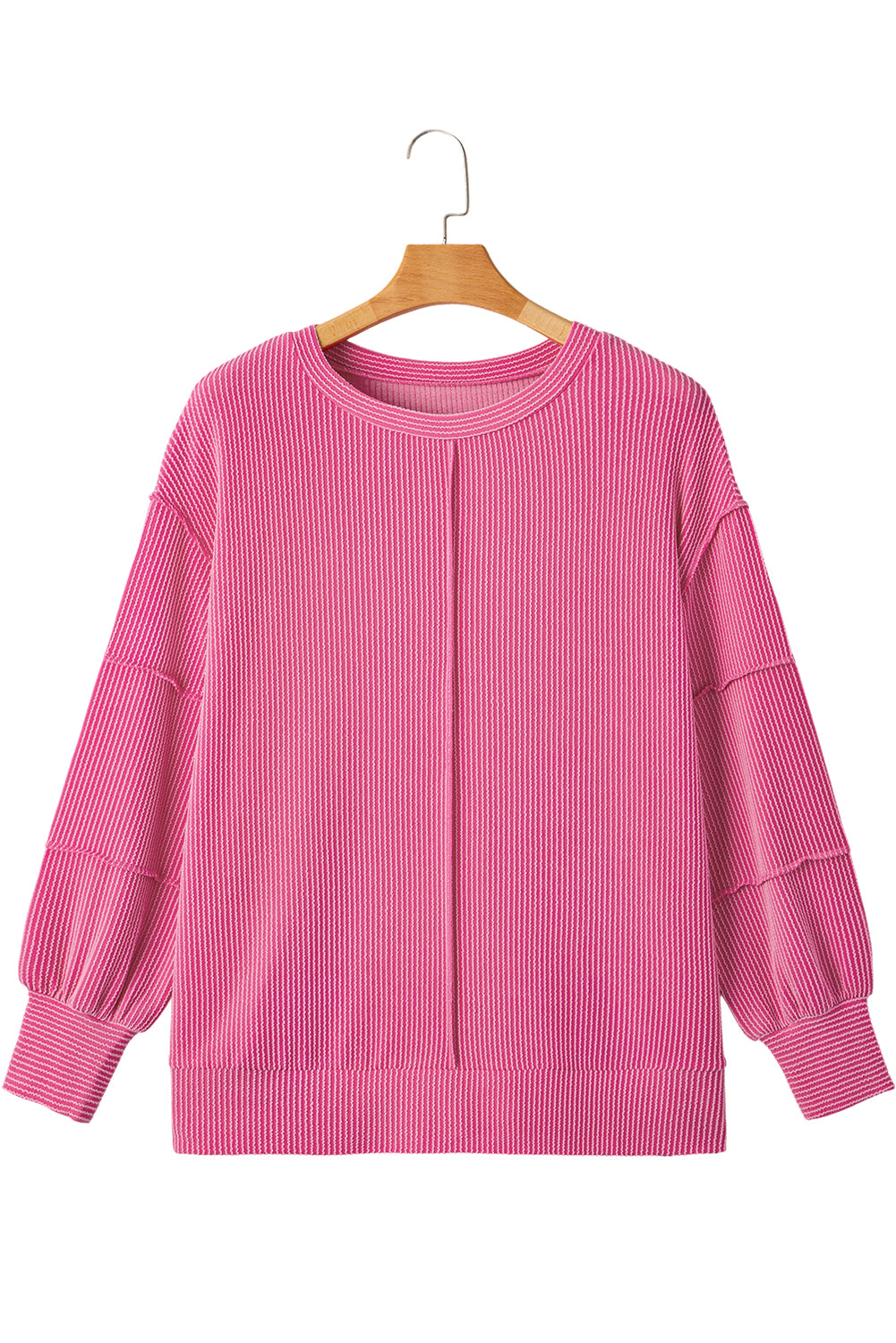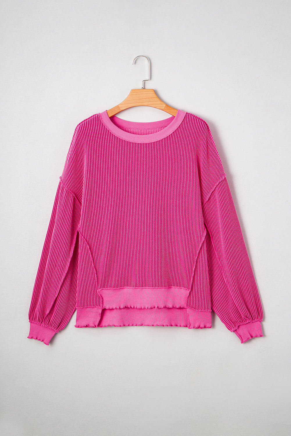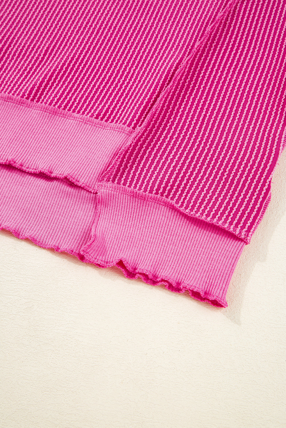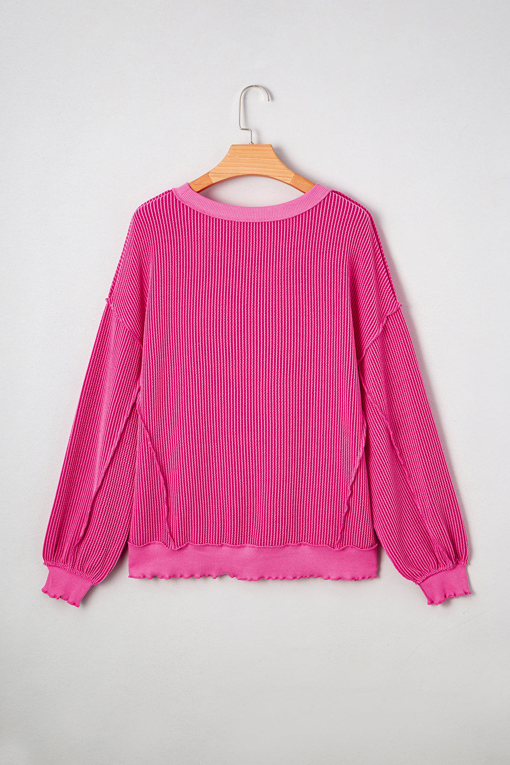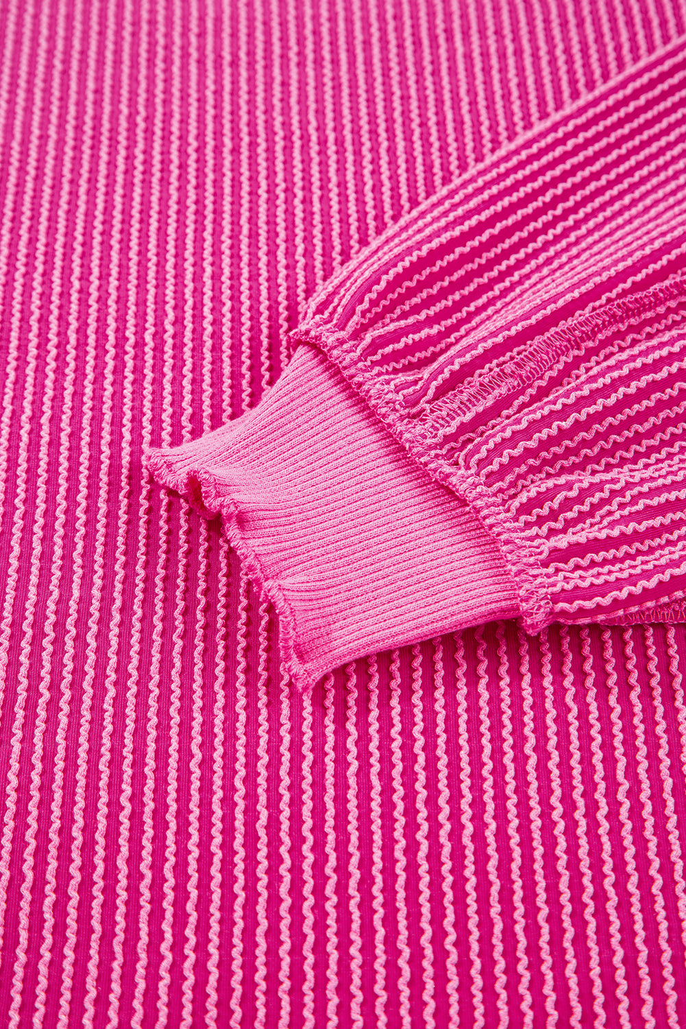 Brighten your wardrobe with The Lucia, a playful long sleeve top featuring a strawberry pink hue and whimsical twisted ribbed texture. Its patchwork seams add a fun, unexpected twist to your casual look, making it perfect for days when you want to stand out with effortless charm. Comfortable and cute, this top brings a fresh pop of color to your everyday style.