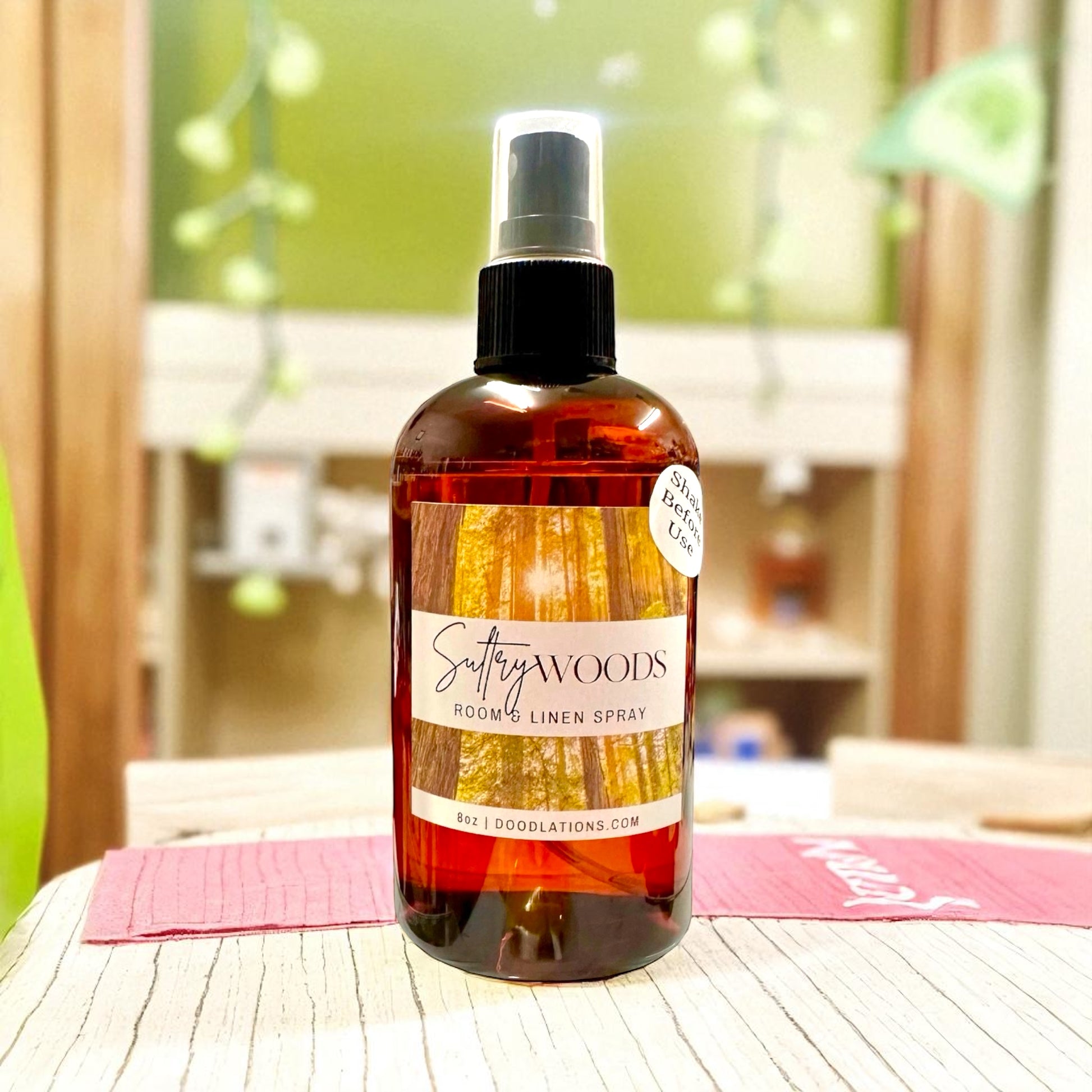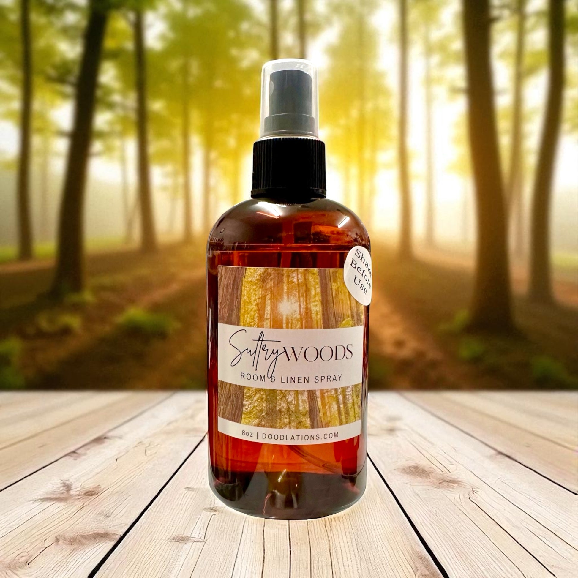 Sultry Woods is a sweet and sultry fusion of mandarin, jasmine, and rich amber with notes of sandalwood and musk. The scent is infused with natural essential oils of cedarwood. This scent has been described as complex, sensual and intriguing. Our new Room & Linen Spray is a must. Spray on your linens or in any room. You can also mist a washcloth and put it in your dryer. How about misting your air conditioner filter to freshen up the room every time.
