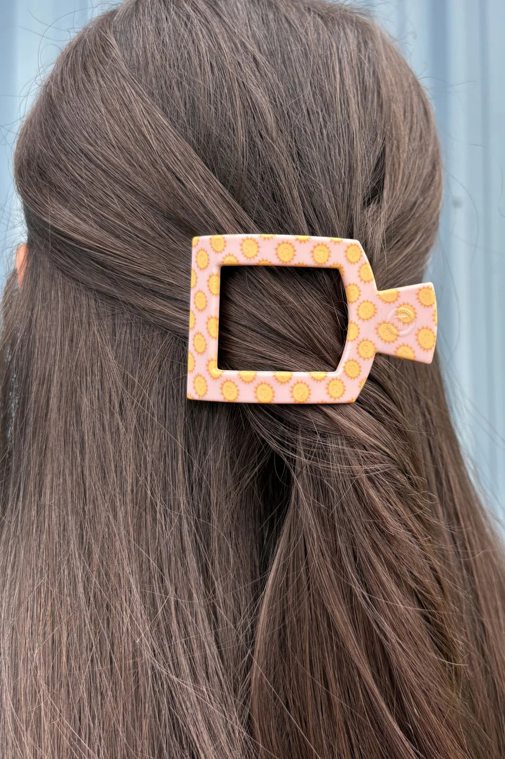 Bring a burst of sunshine to your spring style with the TELETIES Sunny Days Ahead Flat Hair Clip. Featuring a playful, all-over sun print, these clips add a fun and vibrant touch to every look!