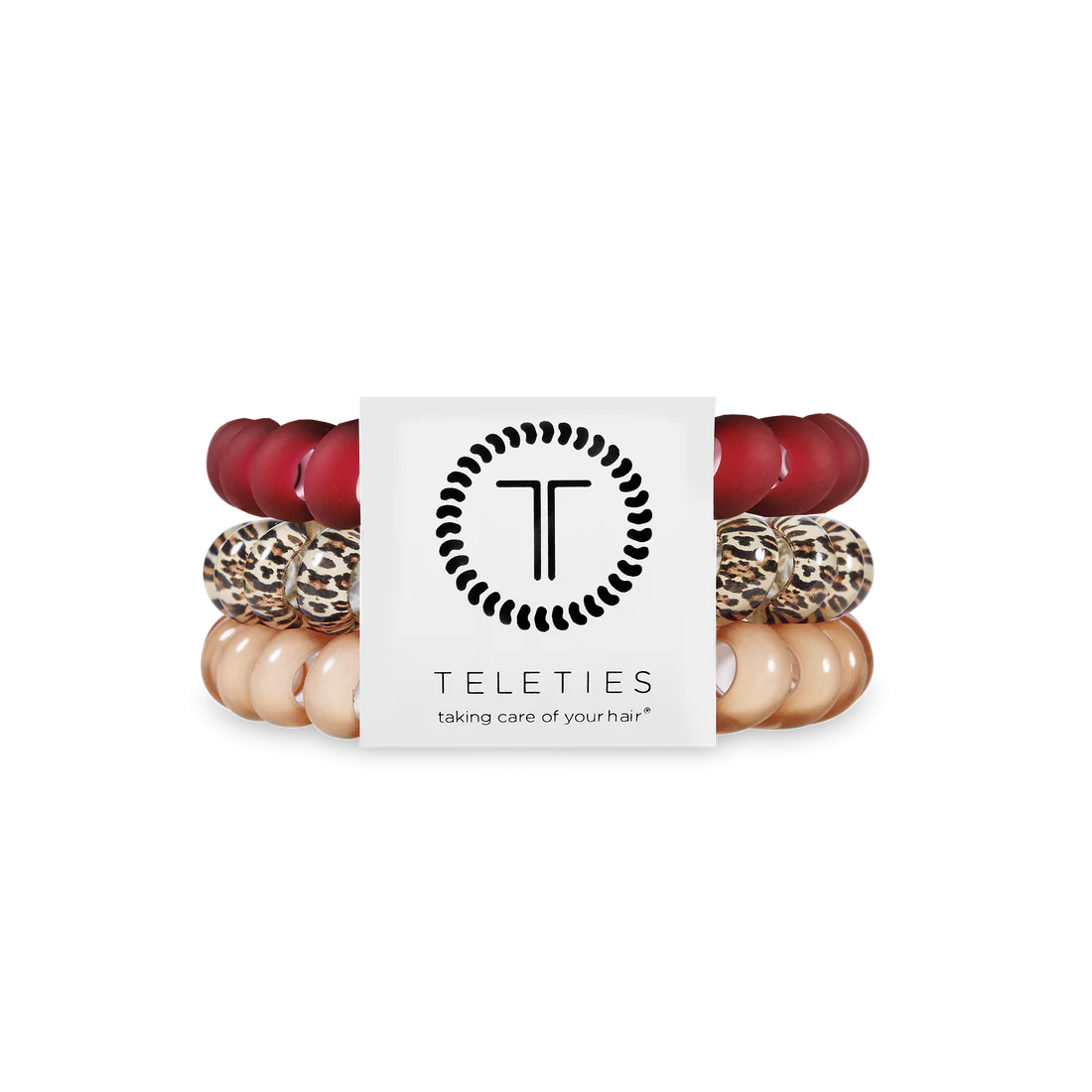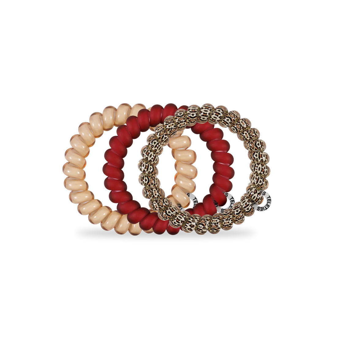 Wild SIde Large Hair Ties in Burgundy and Beige offer a strong grip without damage, doubling as a chic wrist accessory when not in use. Your new favorite hair essentials all year round.